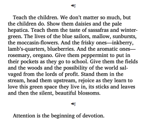 In an excerpt from her short essay Upstream, Mary Oliver frames environmental care as an act of education and devotion. The essay’s closing paragraph opens with the assertion, “Teach the children. We don’t matter so much, but the children do,” as Oliver lists flowers, fruits, and herbs that invite children to inhabit and imagine the natural world as a fragment of their daily lives. Via this focus on the next generation, Upstream models attention in practice. In the context of climate change, this essay emphasizes the necessity of ecological knowledge as a form of resistance to environmental degradation. She notes that children hold “the possibility of the world salvaged from the lords of profit,” responding to environmental extractive capitalism. The final line, “Attention is the beginning of devotion,” which centers this exhibit, is highlighted here through Oliver’s pedagogy, showing that care begins with noticing and engaging with the world.