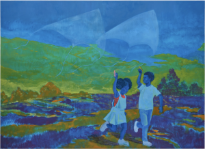 By omitting buildings and other markers of human development, Dominic Chamber’s Leave Room for the Wind constructs a timeless world that is mostly shielded from human influence, besides the two children that are centered in the painting. These figures, which move with the wind as they fly their translucent kites, demonstrate a form of leisure which is only made possible by way of the natural world. At a moment when climate change is often framed within the lens of urgency and disaster, Chambers creates a type of attention for our climate that is rooted in stillness and even childish wonder. While this work may not explicitly reference climate change, Chambers, inspired by Mary Oliver’s poem The Leaf and the Cloud, unintentionally calls for viewers to recognize what is at stake, renegotiating our relationship with nature. Leave Room for the Wind configures nature as a living presence that we live alongside.
