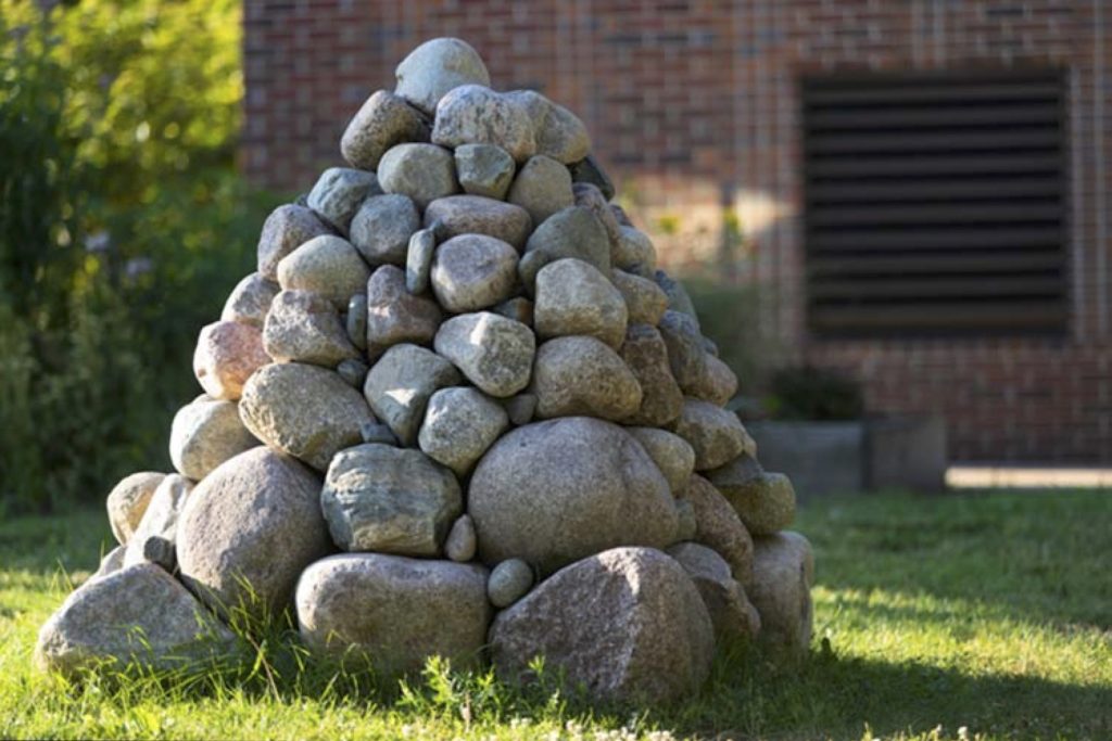 The pyramid-like marker of Aquí Estamos (We Are Here) is made of rocks once hidden beneath ice, gradually pulled to what is now the state of Wisconsin as ice melted in the region. Cortez surrounded the sculpture with corn, bean, and potato crops core to civilizations of the Ancient Americas, reminding viewers that as the rocks recall the impact of global warming, humans also adapt in the Anthropocene through ancient knowledge and care for cultivating land. Balancing natural forms, such as rocks and plants, with the geometric shape of the marker calls to mind the possibility of maintaining hope by documenting both the resilience of humans and the plants that sustain us. In this view of the Anthropocene, hope and pessimism coexist and are grounded in processes larger than each individual.