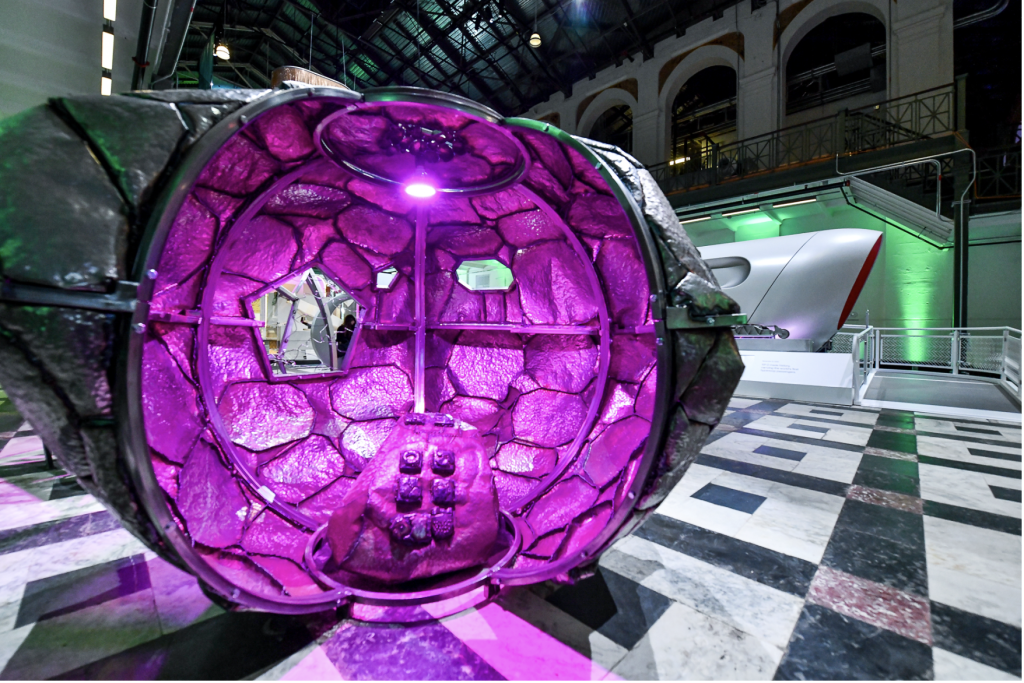 Chultun El Semillero adapts ancient Mayan containers, or “chultunes,” to an imagined space-bound capsule, which would contain Indigenous plants, seeds, and spiritual materials. Like many of her other works, the large-scale capsule is made of hand-hammered steel, returning the industrial material to an organic form. The chultun is illuminated pinkish-purple from the inside, calling to galaxy-like palettes. With themes of human survival, access to resources, and the futurity of climate, Cortez underscores the importance of traditional knowledge and active cultivation of plant life within current and speculative approaches to climate solutions.
