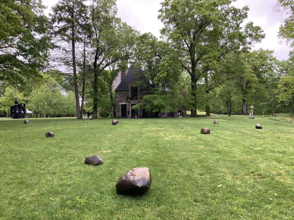 The eleven steel boulders of Cosmic Mirror (The Sky Over New York) accompanied Ilopango, The Volcano That Left at the exhibition at Storm King Art Center in upstate New York, engaging celestial time alongside the geologic time centered in the Ilopango work. Celestial or cosmic time was core to the belief systems of the Olmec people, indigenous to modern-day Central America, revealing yet another mode of conceptualizing time as it relates to gradual environmental change and spirituality. Cortez imagines each boulder as an asteroid fallen from the sky and creates a land-based constellation impossible to see without a bird’s-eye view, centering the celestial over human perspectives and opening a dialogue about humanity’s elusive relationship with the Earth beyond an often human-centered “ticking clock” narrative.