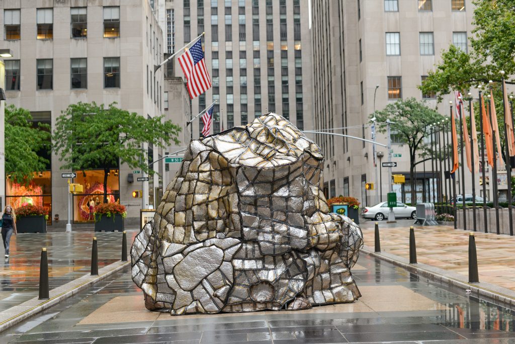 In Glacial Erratic, Cortez juxtaposes long, millennia-old processes of geologic change with the busy foot traffic of Rockefeller Center. Glacial erratics, rocks transported to their location by past moving and melting glaciers, are found all over Manhattan. Made of a steel frame and walls of sheet metal, this glacial erratic references natural forms created before the human era in contemporary materials and is subject to the elements and human interaction of the present moment. Calling to mind the human-influenced glacial melting of the current era, Glacial Erratic connects large-scale environmental processes began long ago and those accelerated by human involvement.