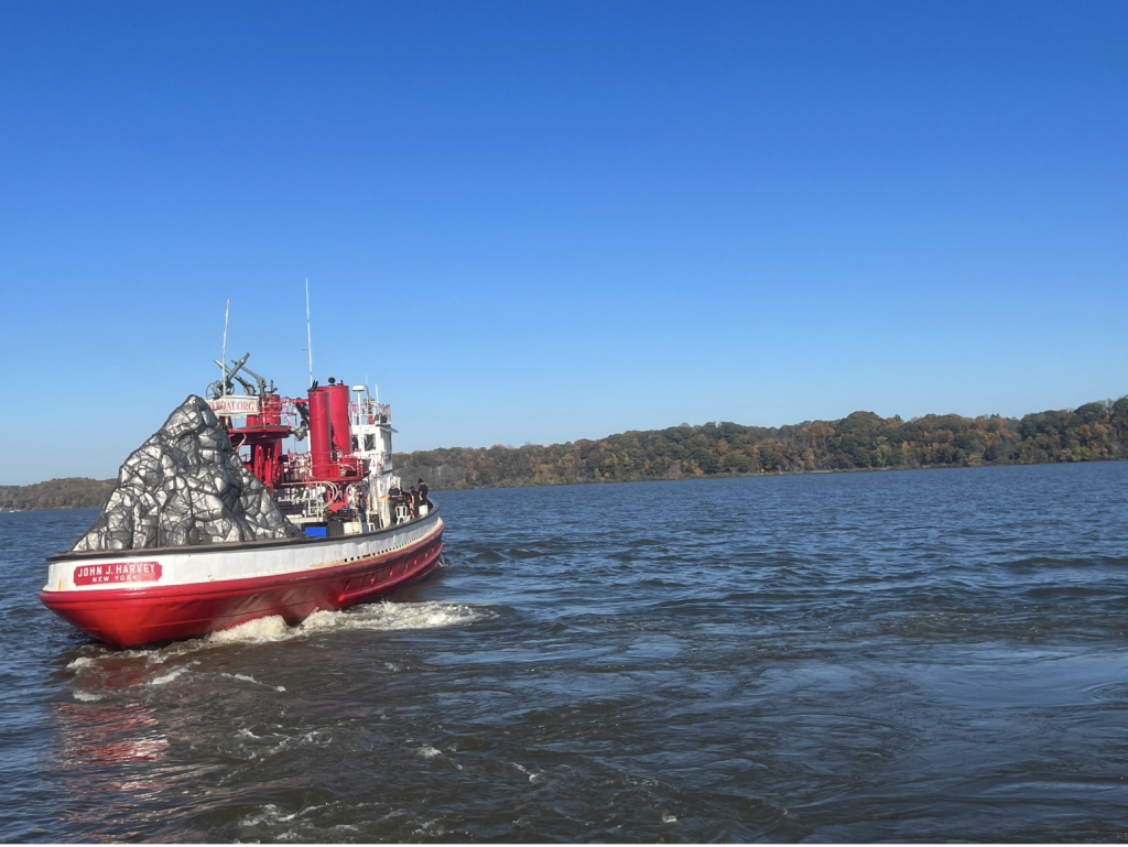 From October 27-29, 2023, Cortez’s Ilopango, The Volcano That Left sculpture turned into a work of performance and social action art. Over time, the original Ilopango volcano left a crater where it originally stood in El Salvador, creating a lake in its place. Cortez’s steel Ilopango reenacted this movement with a journey up the Hudson River to Troy, New York, leaving a volcano-shaped mark on its original location at Storm King. Traveling on a path known to be a hot zone greatly impacted by global warming, the sculpture’s journey connects the geologic time of exploding volcanoes to the acceleration of geologic movement in the Anthropocene, allowing Ilopango to reflect new meanings throughout its migration. Today, as glaciers, lakes, and tides continue to migrate, Cortez poses environmental transformation as inherently related to larger notions of multiple temporalities, ancient and Indigenous knowledge, and change as one of Earth’s constants.