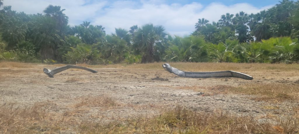 In this site-specific sculpture, two steel whale bones lay on the earth of the Peninsula of Baja California, where an ocean once existed before global warming changed the landscape. By placing the bones at this site, Cortez suggests the coexisting impact of global warming and past colonial endeavors on whale populations in the wider region. The distance between the two bones highlight the different temporalities of climate change and of nineteenth-century colonial efforts that killed many of the region’s whales along the U.S.-Mexico border. Migrante relates the migration of the diminished whale population in California to the movement of humans, suggesting complicated relationships between global warming, species protection, migration, and humans in the Anthropocene.