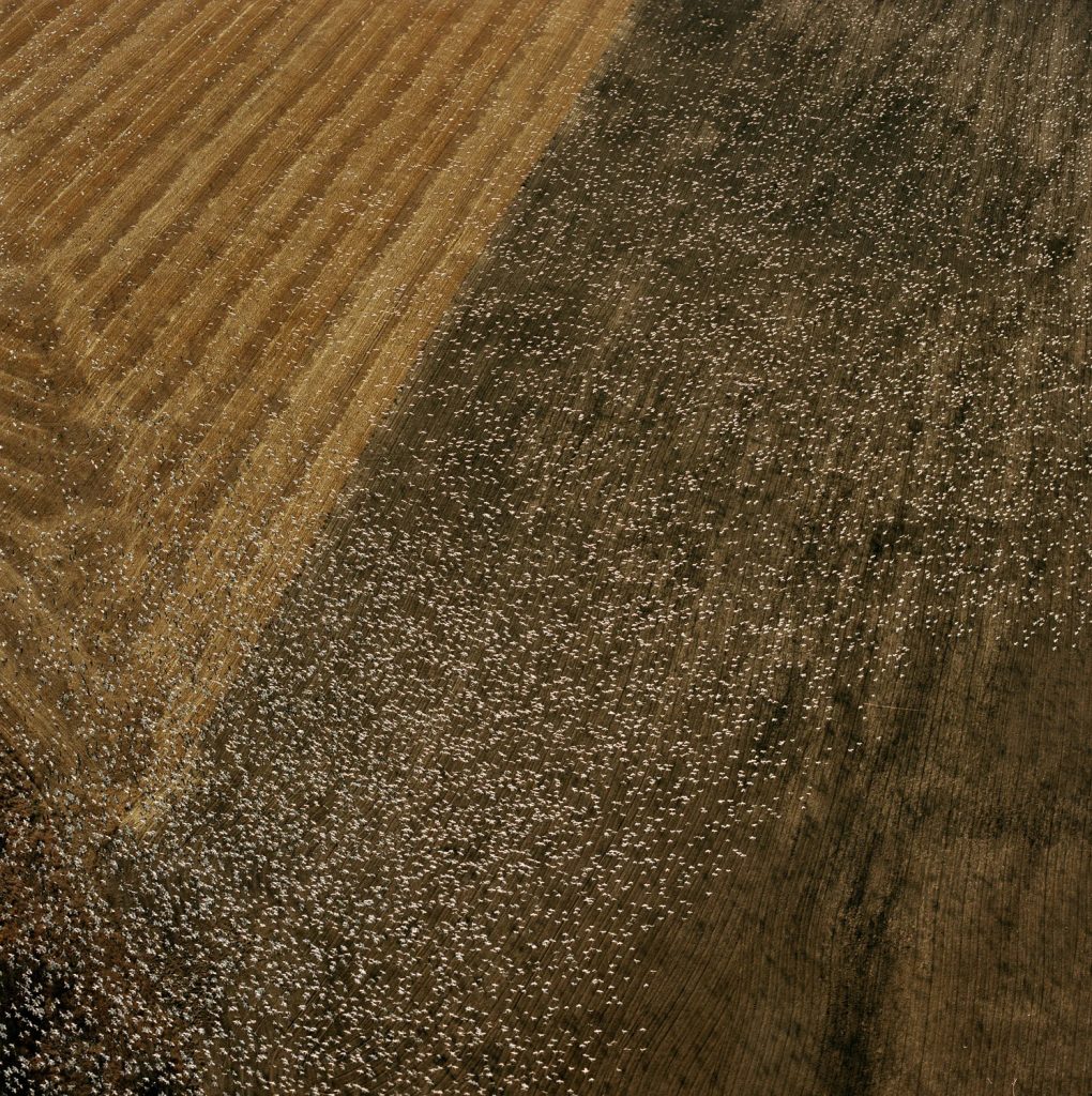 Part of Terry Evan’s Canada to Texas series, this aerial photograph highlights the vastness of the prairie landscape. In this image, we see two distinct fields, one golden and the other dark brown. These are farmlands that now occupy the prairie as a result of human activity. On top of the fields, we can see a large flock of birds, which appear as white dots on the landscape. Their abstraction shows the scale of this landscape by highlighting how much land is been shown in the photograph.