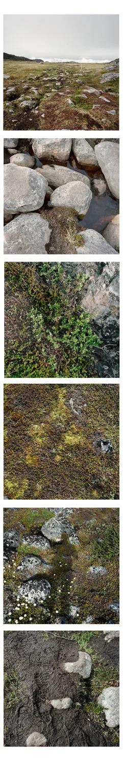 At first glance, one might not notice the human presence and manmade elements present within this grouping of photographs. Instead, one immediately takes notices the greens, browns, blues, grays, and whites that make up the costal Greenland landmass leading to the Jakobshavn Glacier. These are quiet images that, taken together, showcase the small ecological differences that shape how the land exists. However, in showcasing the land, it does not ignore the presence of humans. In taking a closer look at the pictures, we can see shoe prints in the mud, a human shadow, and land markers.
