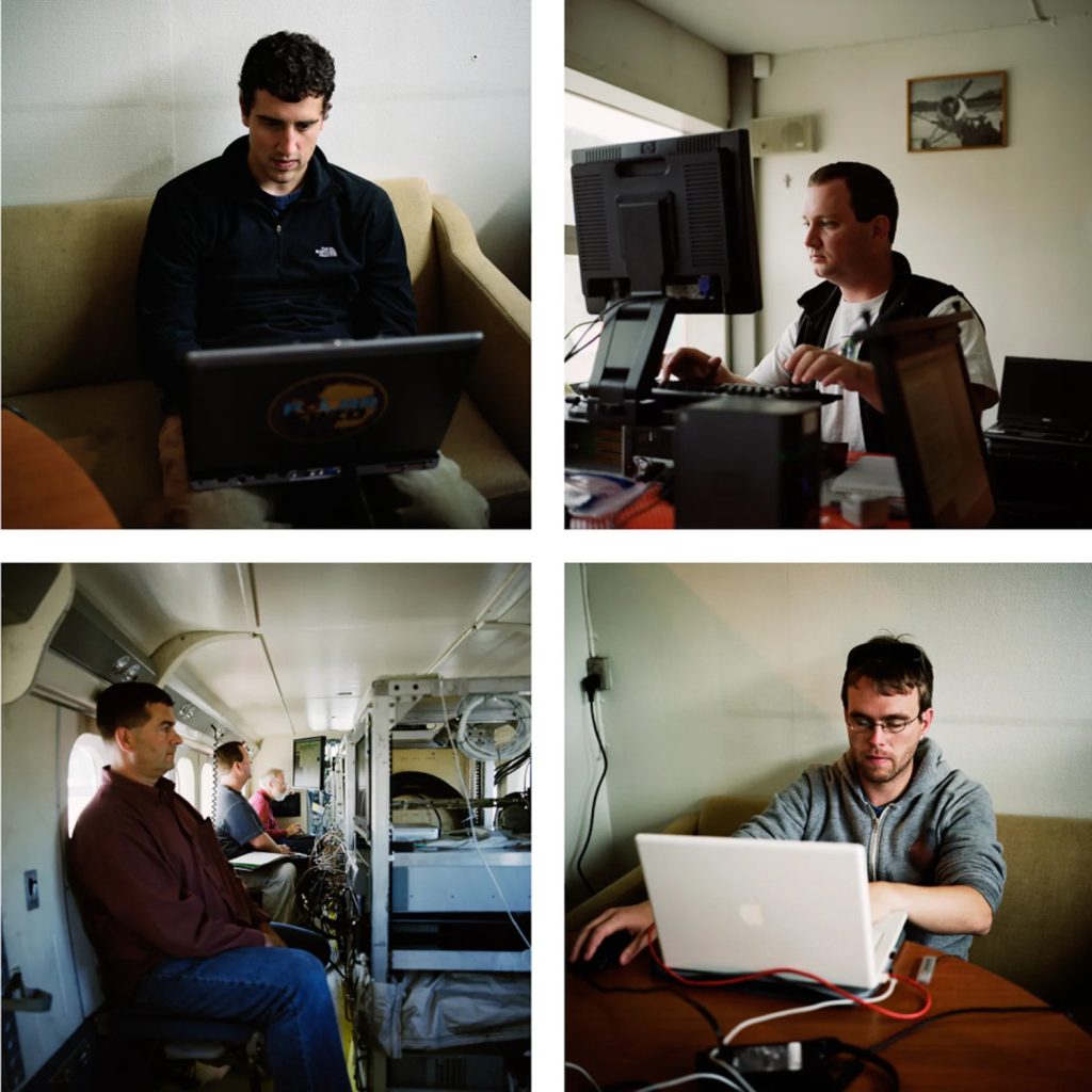 While working on A Greenland Glacier , Terry Evans interacted with a CReSIS and NASA team that was measuring the topography of the Jakobshavn Glacier. She chose to highlight their presence throughout her trip by taking pictures of them at work. As such, these four pictures stand as a representation of the many people who are dedicating their lives to visualizing glaciers and making climate change more understandable to the public.
