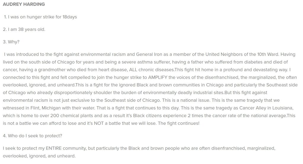 In the project Hunger Striker Statements, Terry Evans takes us through the protests that have resulted from the General Iron relocation from Lincoln Park to the Southeast Side of Chicago. Chicago and the environmental challenges faced within the urban environment are an important aspect highlighted by Evans, as one does not often recognize the city as part of the prairie ecosystem. The prairie here has been altered by human activity and it possesses people like Audrey Harding who has gone on a hunger strike to mitigate the harm being caused by human activity.