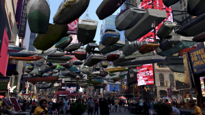 In this collaboration with Microsoft, Chin allows everyday people to view Times Square through a different lens. Unmoored uses a virtual reality cellphone app to visualize what this part of New York City would look like in a continued future of ice cap melting and global sea level rise. Boats drfit between apartment buildings and plankton float toward the audience. Both an immersive visual experience and a startling vision of climate change dangers, this piece draws viewers in and leaves them to think about what will happen if no environmental action is taken.