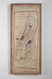 These two pieces present an alternate view of traditional landscape design and imagine how non-Western ideas of Chi can be applied to the flow of energy throughout an area. Different from his technologically-inspired or installation pieces, Topography and Calligraphic Organs of ULSAN ECO Park (Korea) and Park as Five Element Body utilize paper documents and inking techniques to convey place and movement. This alternate vision connects to the conversations we’ve had about different ways of perceiving time and land, how can these perceptions influence how we face climate change?