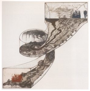 Revival Ramp visualizes the progression of earth’s ecological state. The etching takes shape as a curved path that leads to Chin’s imaginings for three potential climate futures. Both ecological and architectural, this piece draws from the looming factories of the industrial revolution and Chin’s hyperaccumulator plants from Revival Field. By visualizing climate change as a physical path, Chin brings attention to the severity of human impact on the earth and urges viewers to think about which future they would like to inhabit.