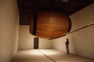 Wake serves as a starting point for the Unmoored installation. The piece is a sculptural installation in the shape of a shipwrecked boat and features a statue of opera star Jenny Lind modeled after one that was attached to the prow of the USS Nightingale. Wake brings attention to New York City’s history as a center of shipping, especially the darker side of this: the slave trade and the transport of guns. Although not as obviously ecologically oriented, the installation makes the viewer consider the past economies that have led to the current state of industry and climate. It also places the audience’s mind in the realm of the ocean, preparing them to experience Unmoored.