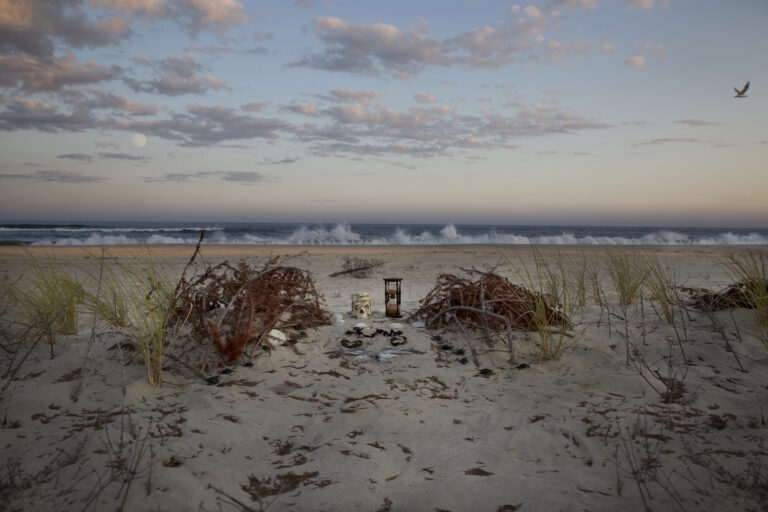 In Christmas Trees Fighting Erosion, de Carbuccia situates her shrine on the shore of Sagaponack, New York. Between two wilting pine or “Christmas” trees lies the vanity and hourglass, encircled by seashells and preceded by what remains of a seagull carcass: the wings. In the background beyond the shrine, one lone pine tree has succumbed to the effects of erosion and has collapsed in the sand. Due to the composition of the piece, our eyes naturally travel from the front of the photograph to the shrine in a seemingly pre-ordained path of death. A path where humans choose to do nothing about the destruction of the Earth. However, off this beaten path, in the right corner of the photo, we see one lone seagull escaping the scene of death. This seagull still has its wings and is free to leave the photo.