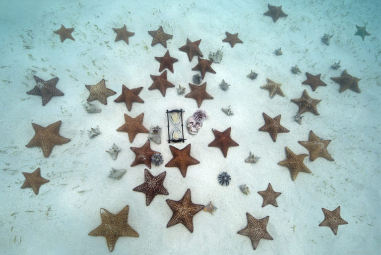 Much like the fifth selected TimeShrine featured in this exhibition, Planet puts the fragility and shortness of human life into perspective with the framing of the photograph. Although the vanity and hourglass are miniscule compared to the planet-shaped bed of coral, they are placed near the planet’s core, or heart. Although human life is small in comparison to the Earth, we are still integral to its fate of either preservation or destruction. As a part of the core of Mother Nature, we have the power and responsibilities to make choices that will help heal this bleached coral and the biosphere as a whole. These choices are those that lead to a life that we can be proud of when it ultimately ends.