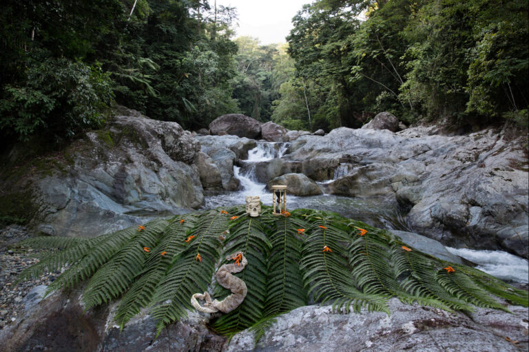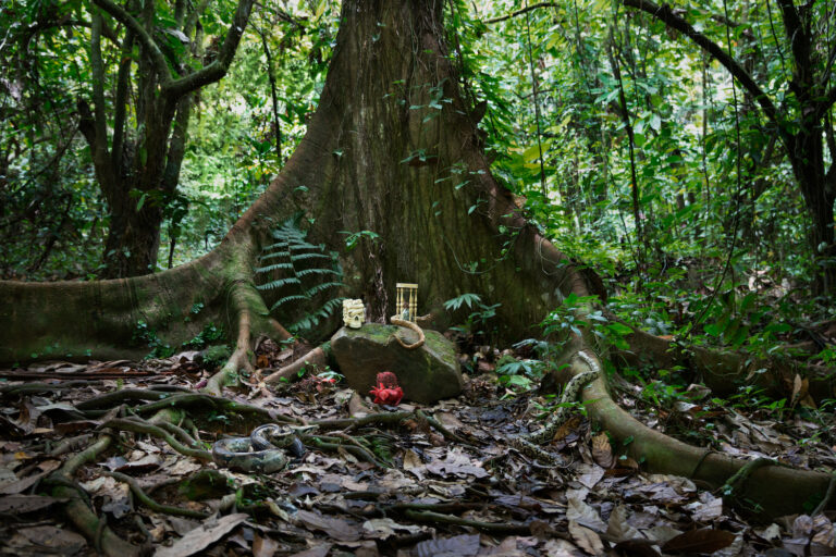 This is another shrine located within the Pico Bonito Rainforest of Honduras. By the title alone, one would think that this photograph would capture another snake interacting with the shrine. However, only the skin of a rattlesnake can be seen, placed by de Carbuccia at the front of the shrine. This juxtaposition represents the passage of time within a single lifetime. Although the skin may no longer be alive, it is an essential part of life for the snake, and therefore still a part of it. Similarly, the possessions and waste we shed in our lifetimes stays behind just like the snakeskin. So, we must choose what we use and how we use it wisely if we wish to lead fulfilling lives that will contribute to the protection of mother nature.