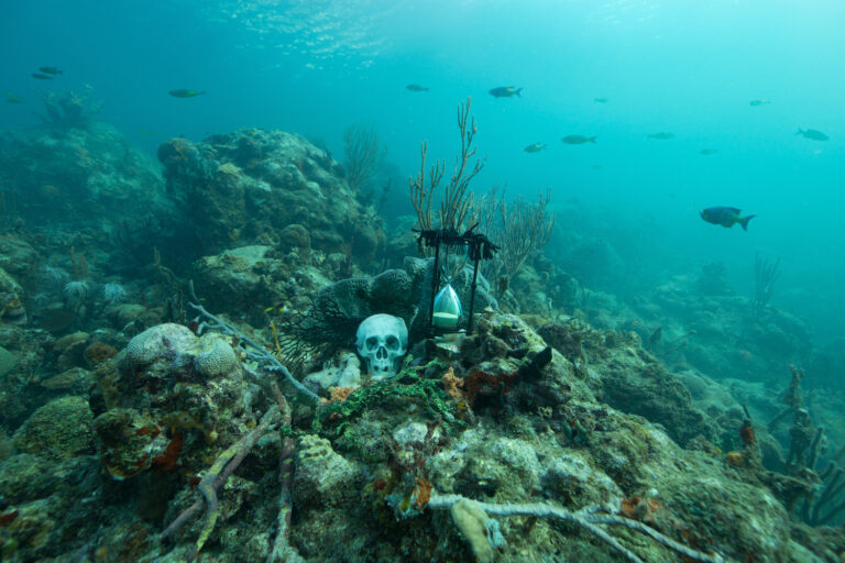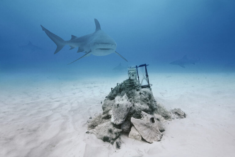 A mother bullshark faces us head on as we observe this TimeShrine in the seas of Mexico. The hourglass and skull are on top of a graveyard of coral– a running theme we’ve seen throughout de Carbuccia’s marine shrines. The death and destruction of coral reefs directly threatens bullsharks, as it reduces their hunting and breeding grounds. This bullshark is not the only mother that is threatened by climate change. De Carbuccia and many other parents fear for the lives of their children and grandchildren. In an interview with news outlet Film Obsessive, deCarbuccia remarks how future generations are “not going to have the same opportunities and… the same quality of life that we’ve had.” This unfair future is “because of the decisions [humans] are not taking right now” within the limited time that we have on Earth.