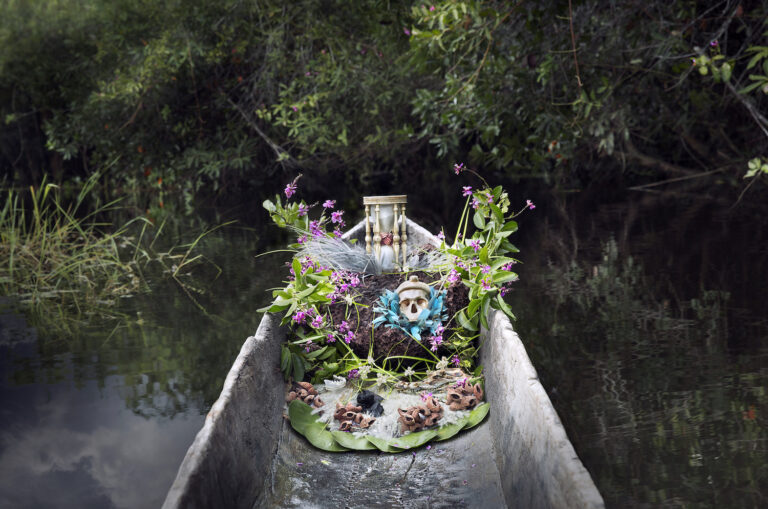 In 2013, de Carbuccia set out on a global expedition. Her goal: to document the fleeting beauty of unique environments across the world before they are lost to climate change. This project took her 10 years to complete. Using objects found on-site for each location, de Carbuccia constructed shrines dedicated to each location’s natural beauty. One commonality between all of her shrines (dubbed the TimeShrine series) are the two hallmark symbols of memento mori: a vanity and an hourglass. To de Carbuccia, these objects represent not only death, but more importantly choice. “…it’s true we are mortal and, you know, we need to be reminded of that,” she explains in an interview about the collection. “But more than anything, what we need to think about every day when we get up is the fact that we have a choice…we can choose whether we want a positive and productive life or a superficial, vain life, thus the term vanity.”