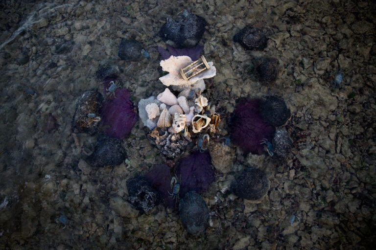 In this shrine, from a birdseye view we observe a vanishing coral reef within the waters of Honduras’ Bay Islands. Below the water, though slightly camouflaged, are blue moon crabs native to the area. Dead coral breaches the waters’ surface, cradling the vanity, hourglass, and the jawbone of a fish. Their position just above the water’s surface creates a sense of tension and anticipation, as it is only a matter of time before the tide changes and the ocean swallows the shrine whole. The crabs seem to be scattered and lost in response to the vanishing reef, running away or to the shrine. This may symbolize how we as humans can either face the loss of nature in wake of our actions and choose to work against it, or ignore it and run away.