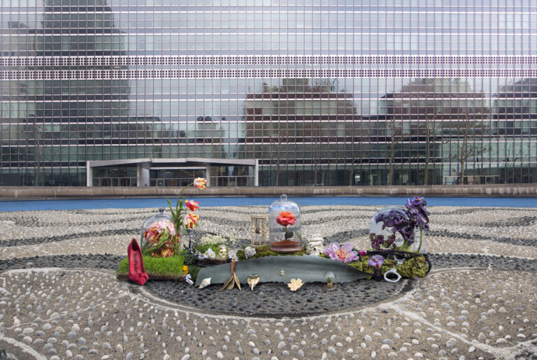 Anne de Carbuccia has stated that this timeshrine was one the the most difficult for her to create due high winds from an impending blizzard. While many of her shrines last at least two days for photography, de Carbuccia only had one day to capture this shrine in front of the UN headquarters due to her acquired permits. In this piece, the hourglass and vanity take a back seat, as flowers and plants comprise most of the shrine. Not only do flowers have short lives, symbolizing the fleeting beauty of mother nature, but flowers are commonly associated with feminine beauty and power, hence the title. The shrine’s centerpiece, an aloe leaf, can symbolize how women’s choices have the power to soothe Earth’s wounds from climate change.
