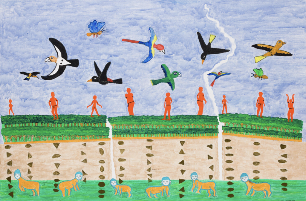 In Yanomami cosmology, the sky is not a backdrop but rather a structure that is upheld by the xapiri, or spirits. As shamans communicate with the xapiri, shamans ensure balance in the forest through relationships of reciprocity and stewardship. However, it is also possible for the sky to crack when this balance is disrupted, as depicted by Mokahesi’s acrylic painting. The painting depicts what would happen if the sky cracks: “all the animals will flee: the macaws, the parrots, the curassows, the tapis, the wild boards, the jaguars—they will all flee. Much rain will fall, and the winds will become very strong, and we will be devoured by the cannibalistic beings, the Ãopatari, who live in the underworld.” Despite this destruction described by Mokahesi, the painting itself does not evoke a sense of apocalyptic fear. Instead of underscoring fear, the purpose of this painting is to highlight the sacredness of the ecological, social, and spiritual balance maintained by the shamans. By emphasizing the vulnerability and fragility of this state of equilibrium, Joseca’s visual translation of Yanomami cosmology opens up discourse around relational repair and responsibility.