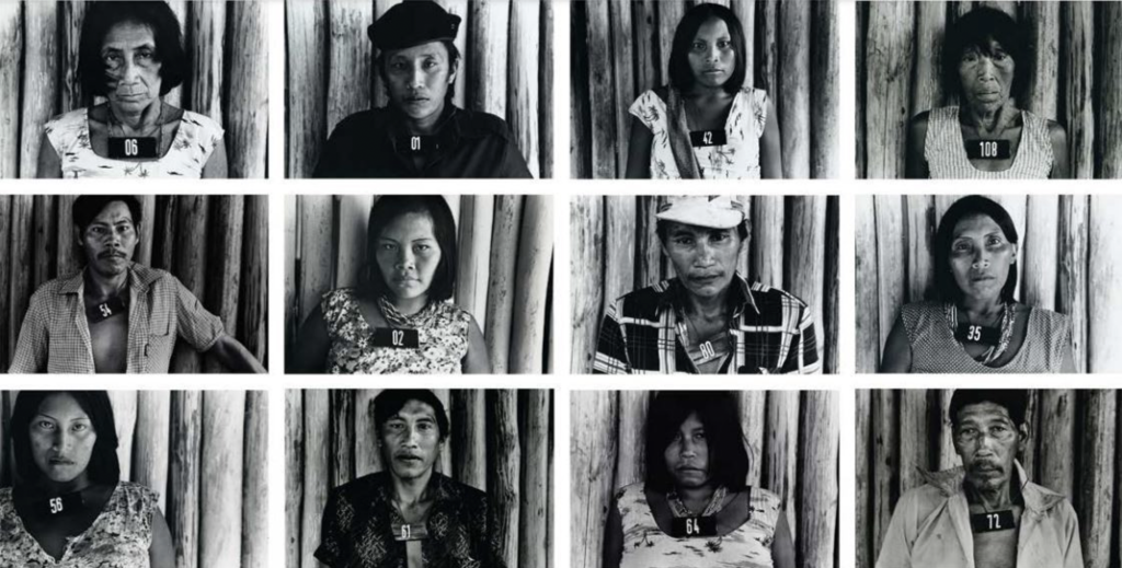 Yanomami people are reluctant to be photographed because of their belief that upon death, one should not leave any trace of themselves on Earth. Despite these beliefs, Andujar established a foundation of trust with the Yanomami community through her committed allyship and activism, and the Yanomami consented to being photographed in order to amplify their struggle for land demarcation. These black-and-white film portraits are a part of Andujar’s series Marcados, or marked. They were taken during a vaccination campaign led by Andujar to combat deadly epidemics transmitted through the forced contact that occured with highway construction and mining. From 1981 to 1984, Andujar photographed every person who was vaccinated with their identification number, each of which was associated with the individual’s medical charts, because the Yanomami did not reveal their names. In taking photographs that focus on the community members’ faces with their identification number, Andujar highlights the direct impacts of extraction to human health in the Amazon.