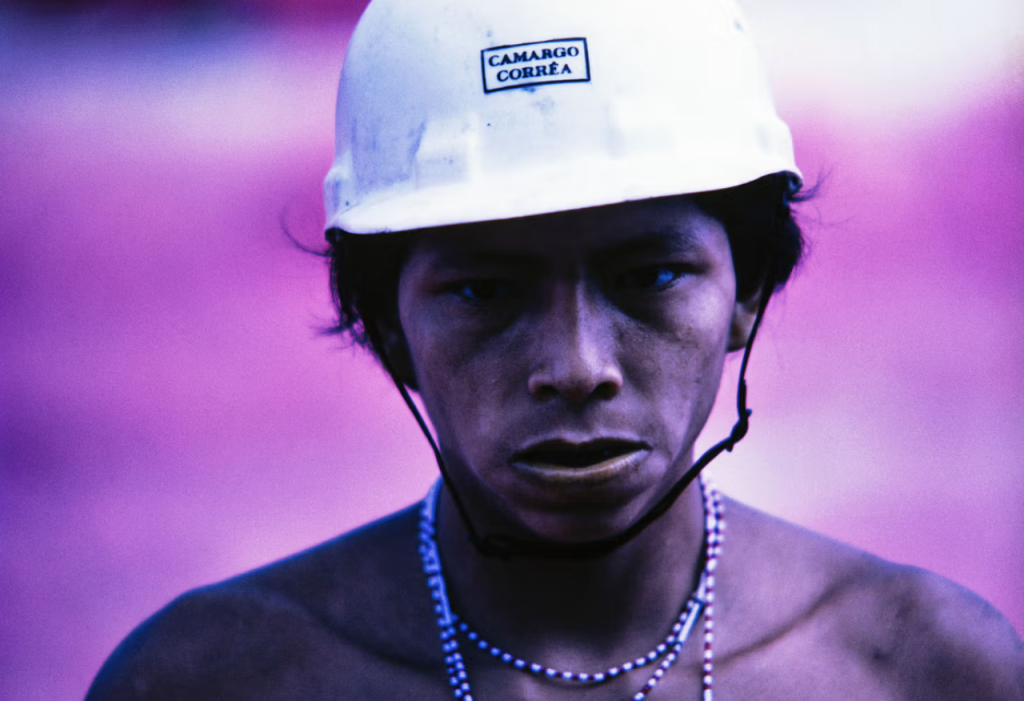 In the 1970s, the Brazilian military dictatorship launched an Amazonian development plan, which included the construction of the Perimetral Norte (BR-210) highway that would deforest and cut through Yanomami territory. The act of building through Yanomami territory not only physically destroyed Yanomami lands, but it also symbolized government permission to occupy and extract. This photograph is of a Yanomami man wearing a construction helmet from Camargo Corrêa, one of the largest corporations involved in the highway construction. Andujar portrays the intrusion of the infrastructure that not only encroaches on the natural resources and biodiversity of the forest but also violently encroaches on indigenous lifeways and livelihoods. While the costs of development and deforestation in the Amazon are central topics in the climate discourse, the costs of community destruction are rarely discussed at the forefront of climate movements, and Andujar’s work challenges that precedent.
