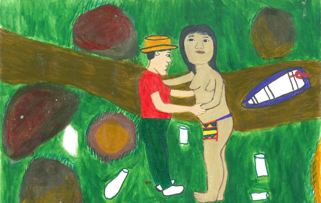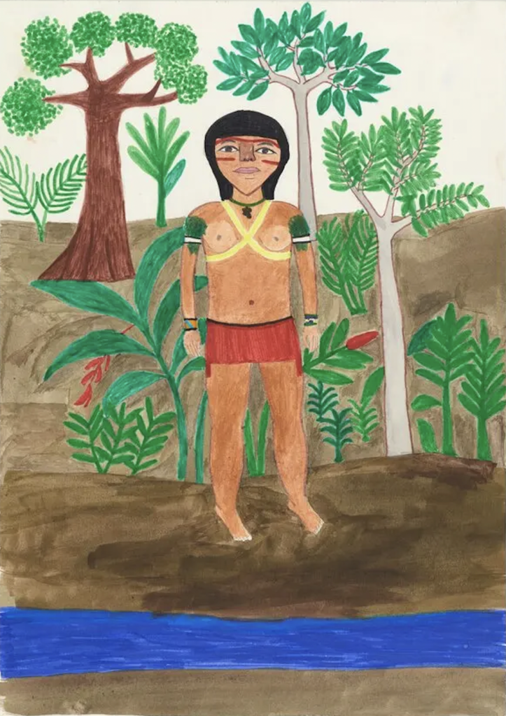 Yanomami land has long faced exploitation at the hands of illegal miners, but during the presidency of Jair Bolsonaro, illegal mining in demarcated Yanomami territory increased by over 300%. This escalation was fueled in large part by Bolsonaro’s dismantling of environmental laws, mining regulations, and organizations focusing on Indigenous land protection. This painting by Ehuana Yaira comments on the rise of sexual violence against Yanomami women associated with the illegal mining industry. In the painting, an illegal miner is pulling a Yanomami girl by her arms to dance with him. The river in the background is polluted, and alcohol bottles litter the ground. While illegal mining in the Amazon is most commonly thought of as a crisis of environmental exploitation, Yaira brings to the forefront the crisis of human exploitation, particularly in the form of sexual violence against women. During her exhibition in New York City, The Yanomami Struggle, Yaira shared her horror when she saw “Yanomami girls of 13 and 14 years old” exchanging “sex for rice, crackers, and pasta… in a brothel inside an illegal mining site.” While underscoring the vulnerability of women’s bodies that become the target of exploitation, Yaira’s piece interestingly portrays the woman as physically larger than the miner. This portrayal of physical dominance is perhaps an act of resistance against the violence and an act of defense of women’s bodies.