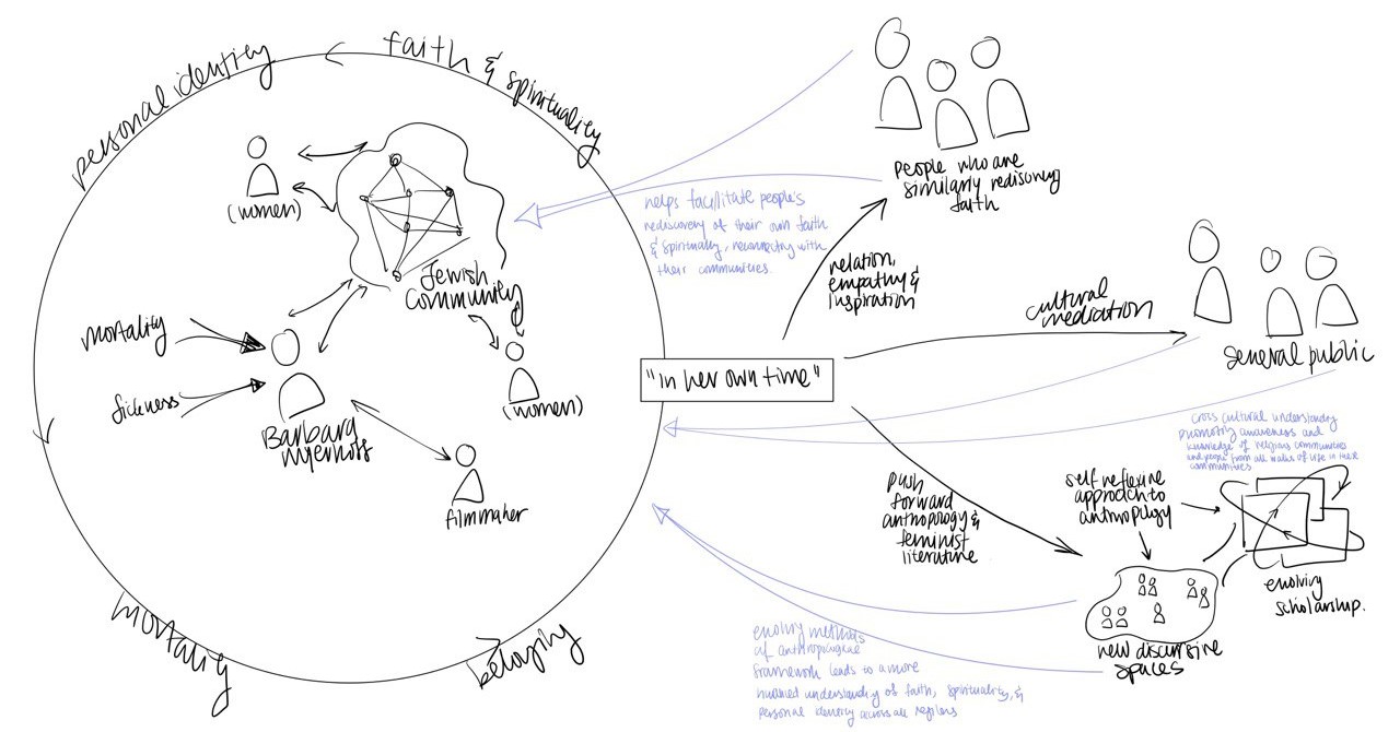 Note that this deconstructing framework can be applied more generally, beyond indigenous films too. Take for instance, “In Her Own Time” (1985), a film documenting Barbara Myerhoff’s social and personal exploration of Judaism in the Jewish Orthodox community in the Fairfax district of Los Angeles, as she faces her mortality. It mirrors indigenous films in the sense that Myerhoff has roots in the Jewish community, and this film is mediating her rediscovery of her culture. Through the process, we witness the intersection of mortality, faith and personal identity emerge, and the film itself highlights issues and adversities that people in the community from all walks of life have undergone. My attempt at capturing the underlying networks of the film and its cultural mediation processes is as follows: