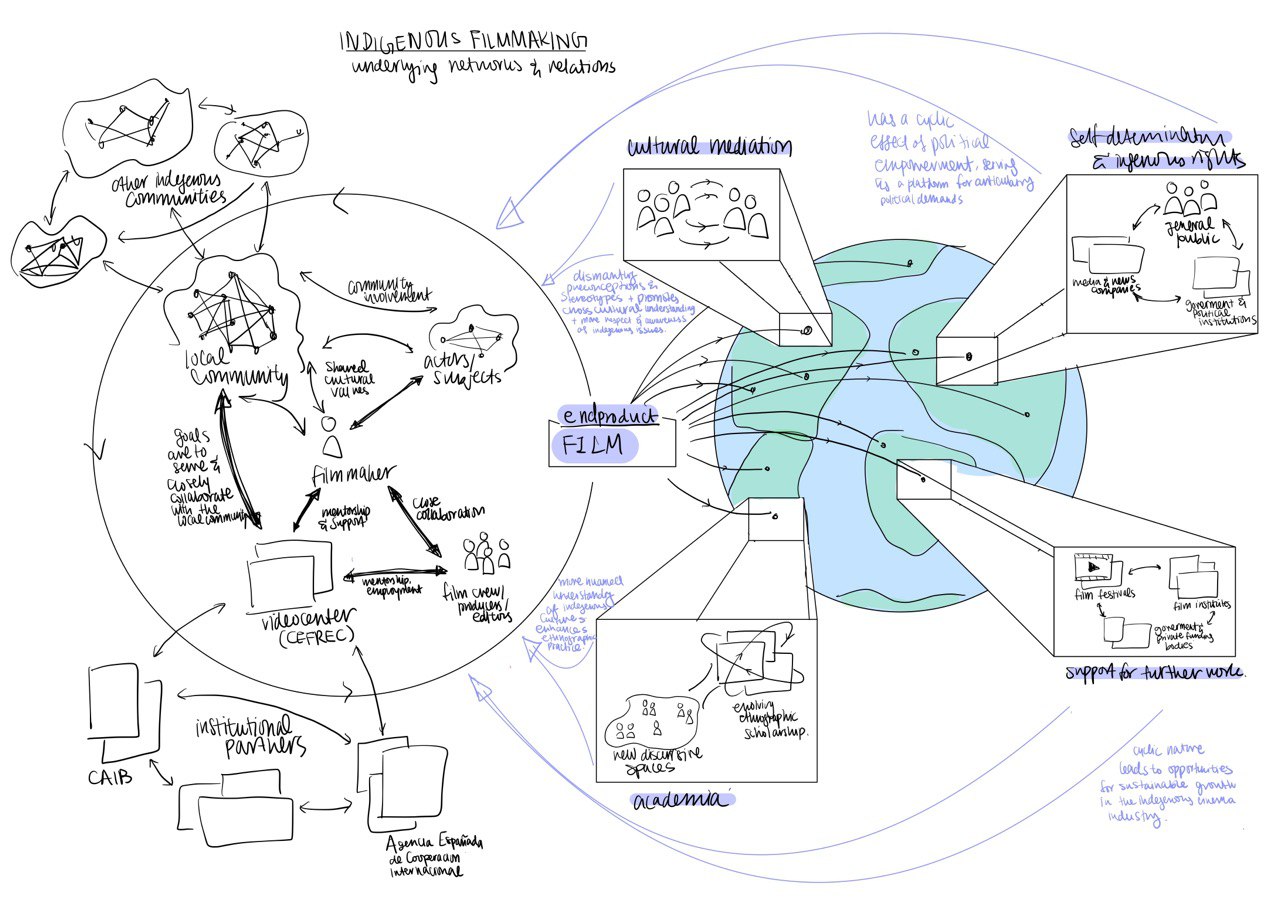 Indigenous filmmaking is a deeply collaborative and networked process, involving a diverse array of actors at local, national, and international levels. This network not only enables the physical production of the films but also shapes their content, distribution, and ultimate impact. The success of indigenous media projects depends on navigating and leveraging these complex relationships while maintaining a commitment to indigenous self-representation and autonomy. It is crucial to make these underlying relations visible, in order to give proper recognition to what Indigenous filmmakers and communities are advocating for, and at the same time. Particularly, as audiences, this framework encourages a more critical perspective of the media we consume, to consider it in context of the relations that constitute it, in order to gain a more comprehensive understanding of the world.