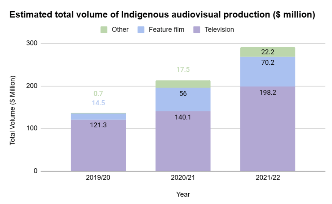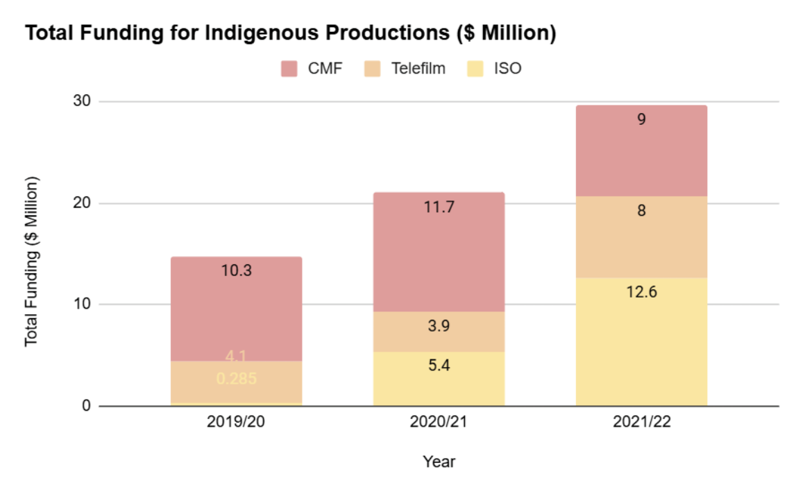 The efforts of Canadian governments and organizations is particularly notable. Over the last three years, there has been a significant increase of 200% in total volume for indigenous audiovisual production and funding provided by different organizations, as evident in the graphs below.