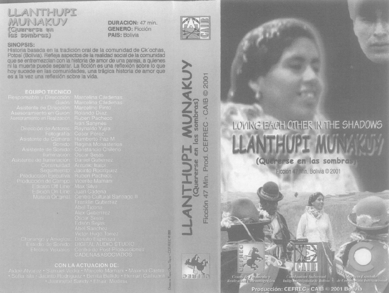 The packaging of “Loving Each Other in the Shadows (Llanthupi Munakuy)” (2001), dir. Marcelina Cárdenas Sausa provides concrete evidence to support their claims. This single, folded sheet of paper provides a concise glimpse into a subset of the complex network of relationships essential for the production of this film. These features include the names of various community members involved in its production. It also contains logos and names of various institutional partners, including CEFREC and CAIB as these organizations are instrumental in offering training and production facilities, enabling the creation of such films in the first place. This is an instance where these invisible relations are displayed, however it is not attached to the film itself, since the packaging may not be known or seen by every audience member, thus it largely remains invisible.