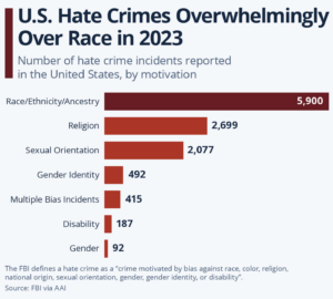 Fleck, Anna. “Infographic: U.S Hate Crimes Overwhelmingly over Race in 2023.” Statista, 21 Oct. 2024, www.statista.com/chart/33300/number-of-hate-crime-incidents-reported-in-the-united-states/.