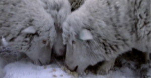 From its beginning, Sweetgrass puts the audience in touch with a visual/audio perspective of what it means to be a non-human. Figure 8 offers three thumbnails of our first introduction to the film’s animal subjects. First, we see them from a distance—as a human would. Next, we are no longer observing the sheep but, instead, become the object of the animal’s stare. The scene becomes both comical and unsettling because, while the sheep is really staring at the cameraperson behind the lens, it feels as though the sheep is actually staring at us. Castaing and Barbash then become part of the mimetic process—something that we and the sheep both look and emote through. They become a part of the landscape that, invisible to the audience’s eye, allows for a new set of relations between audience and animal to take place, for the film’s human audience to begin viewing the animal as more of an equal—and for the camera to begin taking on a consciousness of its own. The third and final thumbnail camera encourages the audience to immerse itself in the body of the animal—for the audience to view the ground, the process of eating as a sheep would. This progression of thumbnails—which appear so early on in the film—offer a preview for the kind of work Sweetgrass hopes to get done. Like Castaing, who wears a camera on his head for parts of the film so as to make the camera an extension of his own body, Sweetgrass understands that “the world is not something that is given to us but something that we engage in by moving, touching, breathing, eating” and that through this act of participatory viewing/hearing we can more easily become a part of this new world that we are observing (Escobar, 82).