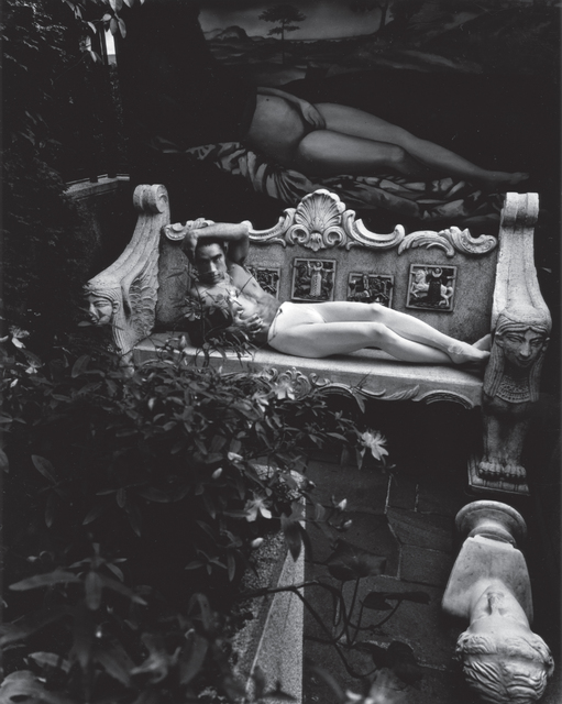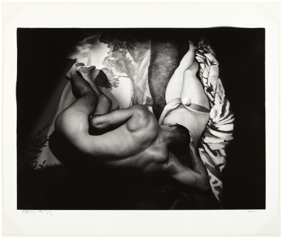 How should we understand this juxtaposition of Mishima’s nude body and the Renaissance painting of Sleeping Venus? One may gain more insights by examining this photograph in relation to other photographs from the Barakei series that also employ this copy of Giorgione’s Sleeping Venus as a prop. In the No. 41 photograph from the series, for instance, Mishima lies horizontally on an elaborate Baroque-style bench in a garden with a classical sculpture bust (Fig. 3-2). Behind the bench hangs the painted backdrop after Giorgione’s Sleeping Venus. The partially reproduced body of Venus lies parallel to Mishima’s body. Instead of including any representation of the entanglement of the two bodies, both the photograph on display and the No. 41 photograph portray a parallel relationship between Mishima’s body and that of Venus. In another case, Mishima is seen in a posture of contemplation in the lower part of the No. 16 photograph from this series (Fig. 3-3). The body of Venus and another image of two embraced semi-nude male and female bodies are juxtaposed above Mishima’s head, as if these two images are what Mishima is puzzling over. More interestingly, Hosoe inserts a dark gap between the image of the two entangled bodies and the painted copy of Sleeping Venus, which is visually connected to Mishima’s body without any gap, thus highlighting the different kinds of relationship between the two groups of male and female bodies. In other words, in all three aforementioned photographs that group Mishima with the painted copy of Sleeping Venus, Mishima assumes a position of reflection that both engages with and is detached from Venus’ body. Such juxtaposition turns these photographs into Mishima’s performance of his own self-reflexive journey, during which he sees himself both with and against Venus’ body––in Hosoe’s words, “Mishima’s Venus would be borne by merging his flesh with the half-painted Sleeping Venus.”[2]
