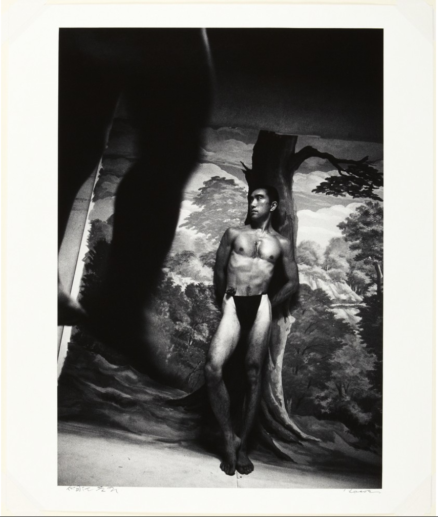 What further complicates this photograph is the revelation of the setting of this photo session, which pulls the viewer out of the scenery of the martyrdom of Saint Sebastian and calls attention to the image’s fictionality and performativity. Hosoe chose to shoot this photograph with a canted angle from a distance in a snapshot style, thus disclosing three of the four sides of the painted landscape backdrop and its hastily applied brushwork at the edges. In addition, the photograph also includes a blurry shadow of the legs of an unidentified jumping person in the foreground, which inserts a sense of motion and time into the seemingly timeless image of Mishima in disguise of Saint Sebastian. The inclusion of the edges of the painted backdrop against the studio’s white wall and the blurry legs in motion reminds the viewer of the creation process of this portrait of Mishima, which, though reminiscent of a timeless Renaissance painting, actually resembles a live performance on a theatre stage. By breaking the third wall for the viewer, this photograph is self-reflexive of the production process of the Barakei series. Thus, through the enactment of a cultural token of homosexuality––one that also marked the threshold of Mishima’s self-examination of his sexual identity, this photograph both restages Mishima’s private investigation of his sexuality into a public performance and reflects upon the performative nature of the photograph itself and essentially all photographs in the Barakei series.