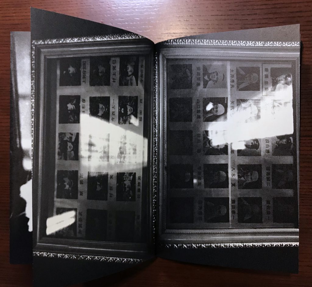 This photograph features a framed portrait of a young man in military uniform and a neatly folded uniform in front of the portrait. From the style of his uniform and the epaulet, it is possible to identity him as an aviator from the Kamikaze Special Attack Unit. The way that his portrait is arranged with a folded uniform suggests that the framed photograph is probably a memorial portrait for the deceased soldier. In a succinct, straightforward way, this photograph presents to the viewer a melancholic episode of a person’s life and a nation’s past. Curiously, on top of the upper part of the photograph, there seems to be superimposed layer of a blurred image of a piece of handwriting. In light of other similar photographs of personal objects in the series, this blurred image is most likely a reflection on a glass placed in between the photographed subjects and the photographer––Kawada probably took this picture behind a glass in a museum-like setting. The presence of this faint yet unignorable reflection calls attention to the physical and temporal gap between the viewer and an inaccessible past that the portrait refers to. In the photobook The Map, this photograph is grouped with other photographs that document similar personal objects left from the wartime––portraits, military manuals, personal writings including notes of last will (Fig. 7-1). Like the framed portrait of the Kamikaze pilot, most of these personal items were photographed behind a glass in a public, museum-like setting.