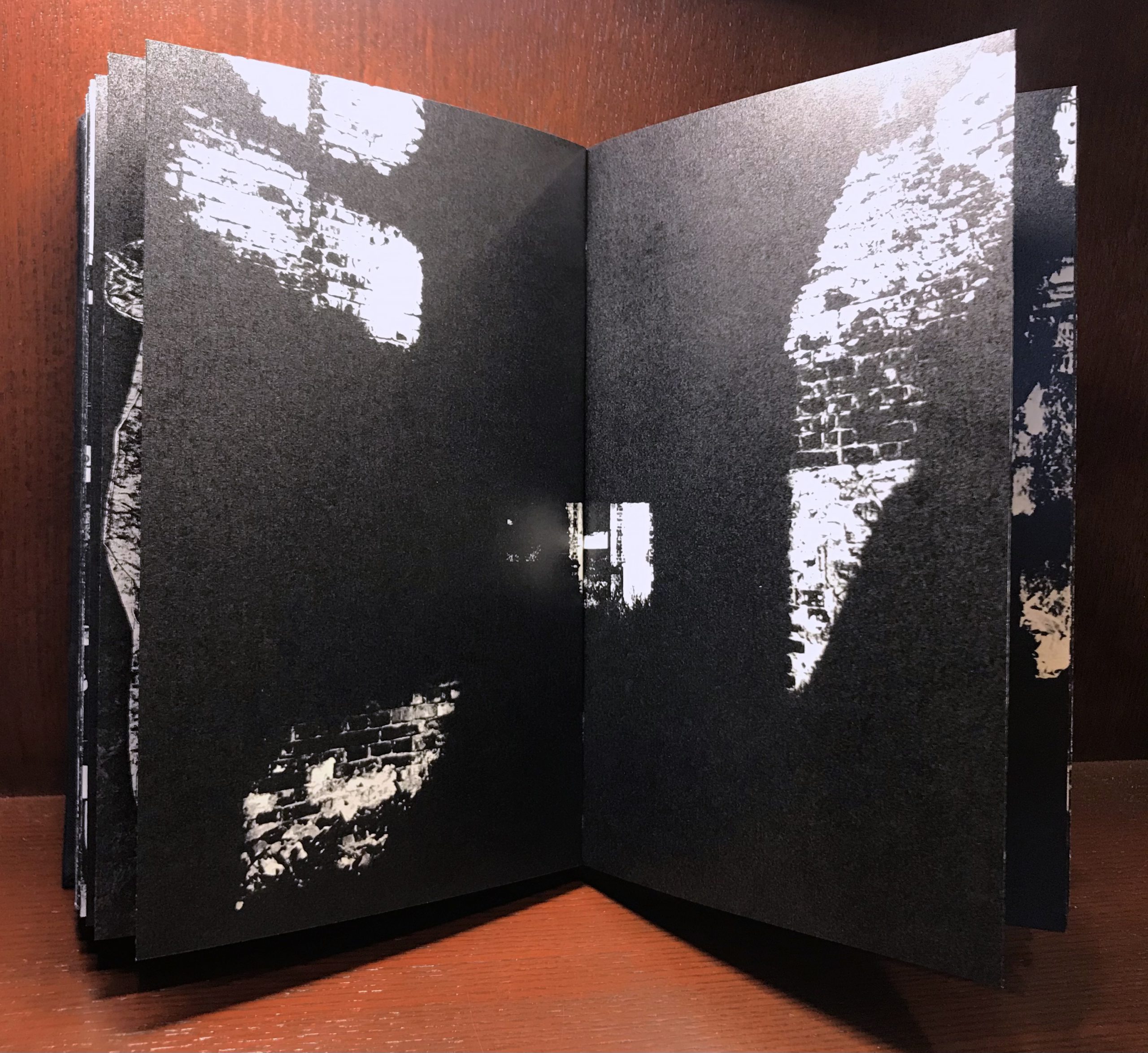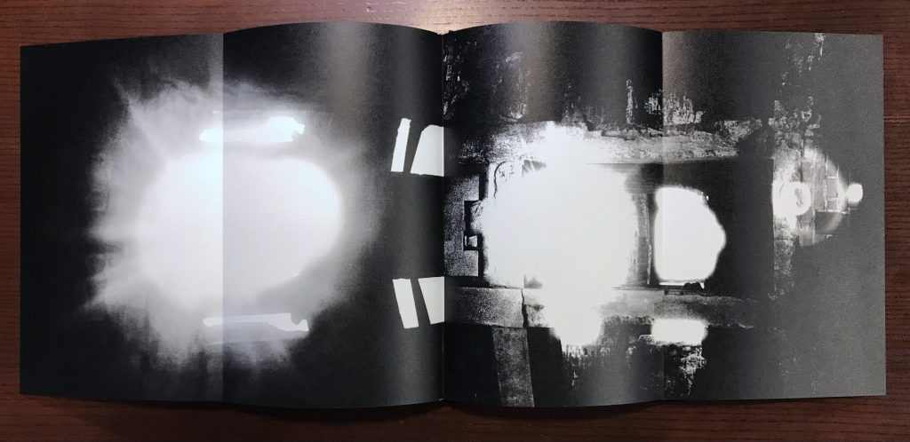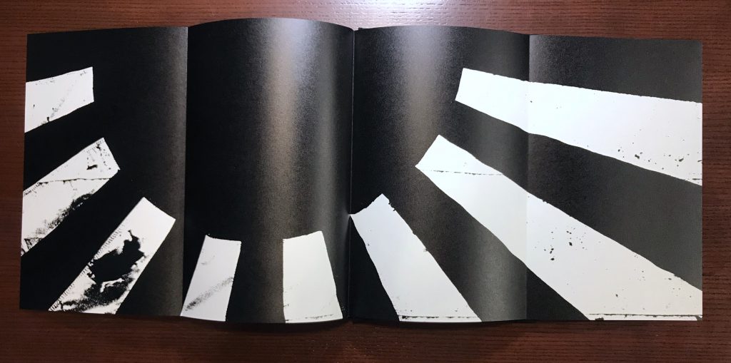 Through strategies of abstraction and symbolism, this group of five photographs printed on two sets of kannon-biraki gatefold pages––starting with the photograph of a trampled Japanese National Flag and ending with the image of a partially viewed Japanese navel ensign––merges together architectural ruins from the wartime and national tokens available in the contemporary political and social life in the 1960s. As a contemporary viewer folded and unfolded these pages, the contemporary social reality would mirror and overlap with memories about the past in both visual and metaphorical ways––any established linear, historical narrative, along with the concepts of ruin, war, monument and nation, became called into question.