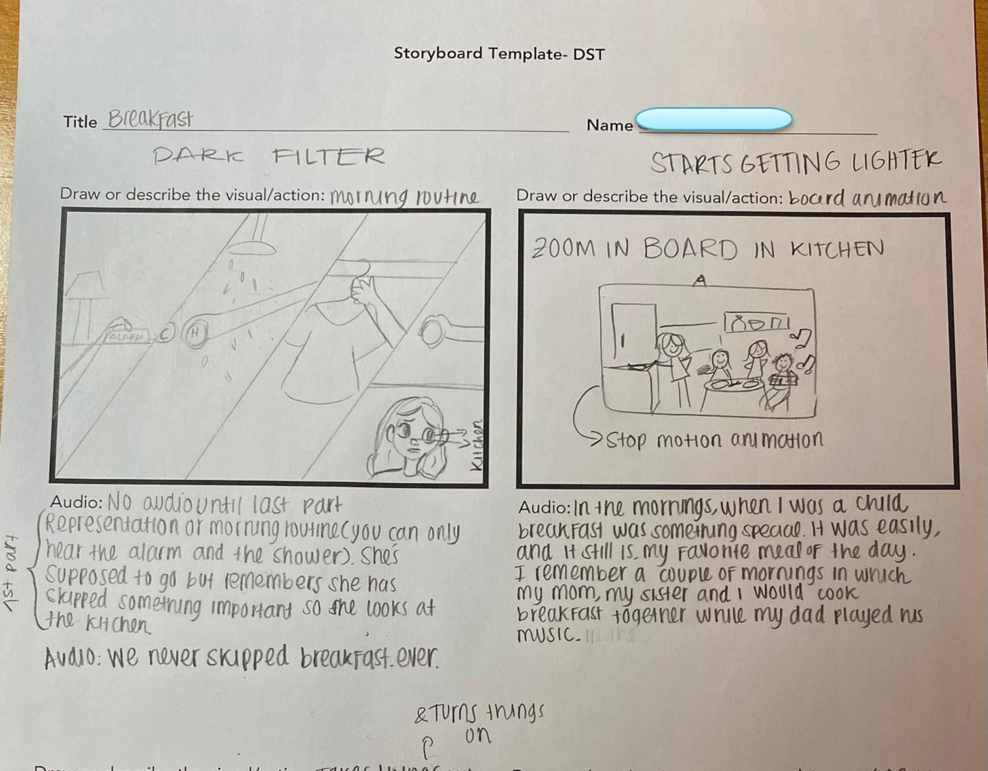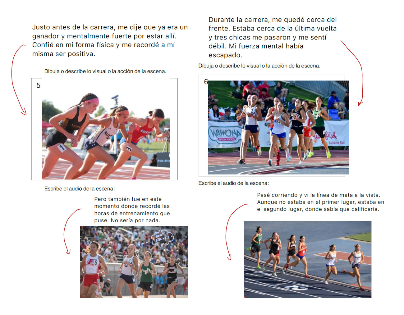 Crea un guion escénico o storyboard. Use the template to carefully select images (only your own pics or drawings) and place them so as to build an emotional impact on your audience. Below each image include the part of the script that better suits the image. Have in mind the economy of language and visuals: Avoid being redundant (e.g. image and words describing the same: “Estaba lloviendo” and we see an image of “lluvia”). Your storyboard will be peer reviewed.