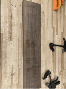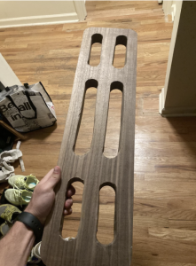For the construction, we used a walnut wood plank. We used a shaving saw to flatten the wood first. We then used a push drill to create the desired curvature at either end of each hold. We then used a jigsaw to cut out the holds, a router to create the angles we wanted in each hold, and then a sander for the finish.
