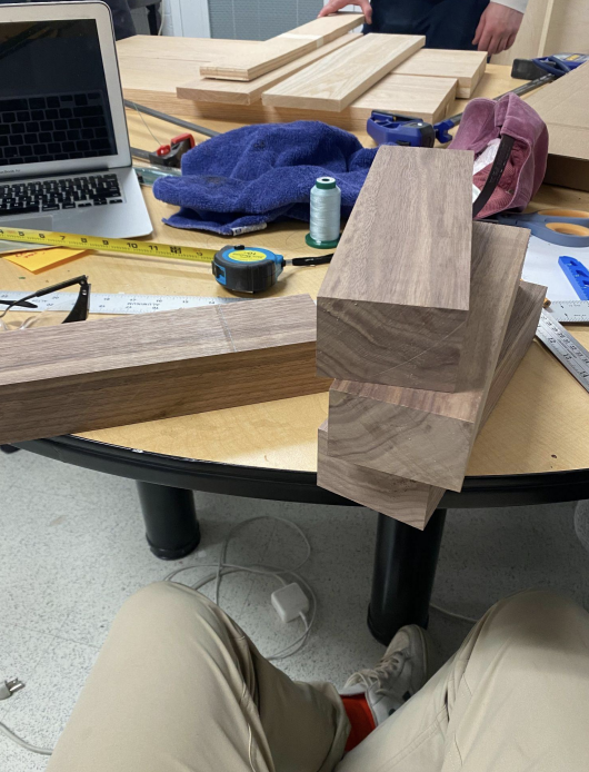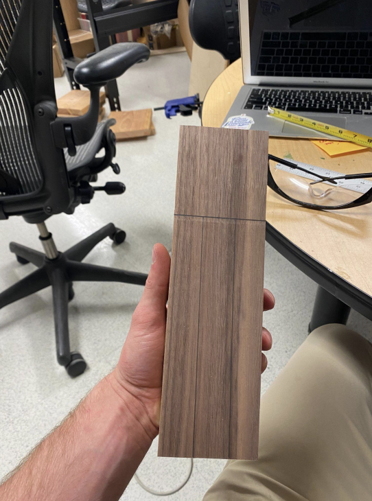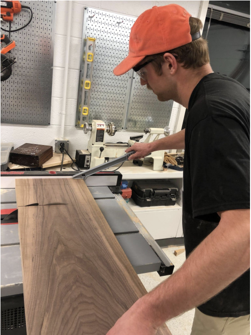The first step in the project was to acquire dark walnut wood that we obtained from a local lumber yard called Willard Brothers Woodcutters. We got 3 feet of 12×2 walnut that was cut down from the larger board for us. We then brought this board back to campus to work. (Figure 1.)