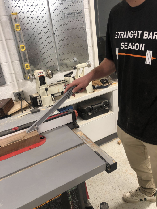We then took our 3-foot board to the table saw in order to cut it into workable blocks for our spoons. We did our first cut which separated the board into a 2-foot piece and a 1-foot piece. The next three cuts were done on the 1 footboard. We measured and marked out 3-inch segments to create 4 of this 3-in by 1-foot blocks. These blocks were the basis for our spoons. (Figures 3.