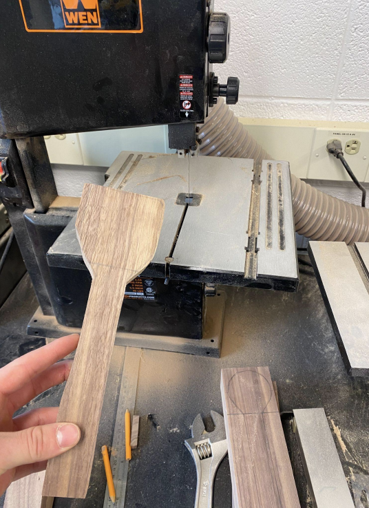 In order to make the carving process easier for us, we then cut out the spoons from the base blocks using the vertical band saw in the maker space. This left us with the rough outlines for the utensils that would be much easier to carve because there are fewer cuts to make to get the external material off. (Figure 6.)