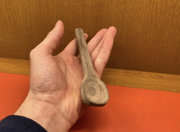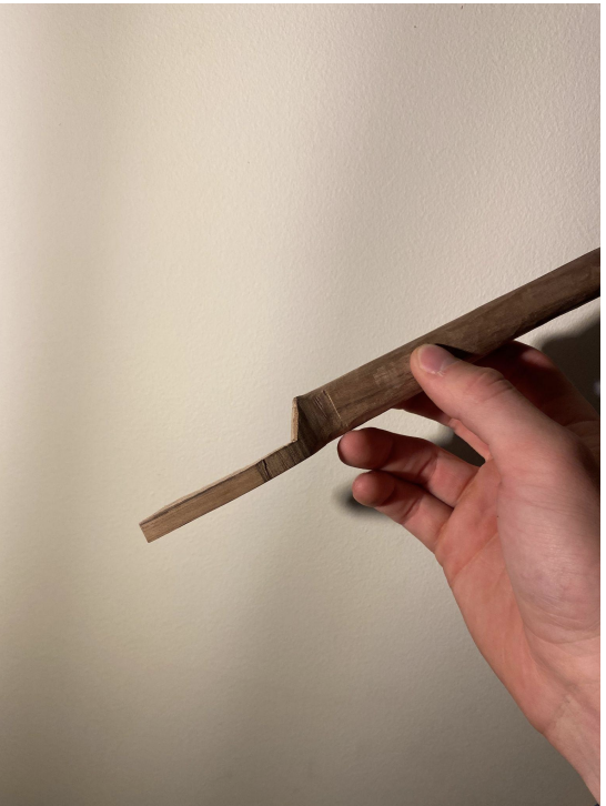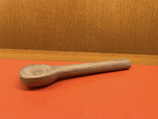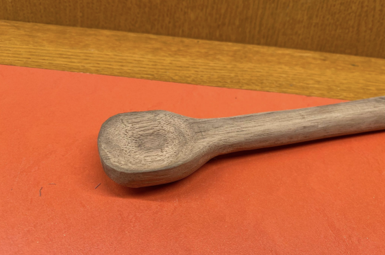 Next, we again carved the shape of the handle with the carving knife. This took a considerable amount of time due to the hardness of the wood chosen. We worked along the grain again and tried to eliminate sharp corners in order to round the handle. Given that this would be a spatula, we did not need to work to carve out a bowl. The bulk of our work came from trying to smooth the ‘flipper’ of the spatula and the downslope from the handle.