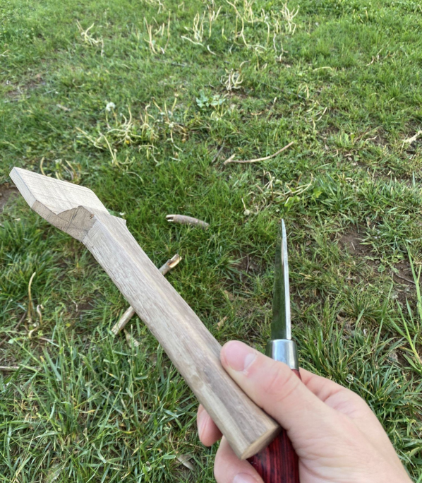 At this point, we were ready to carve the spoon. For this, we used a carving knife that we ordered online. We worked on the outer material first, shaping the handles into round cylinders. We carved along the grain of the wood, which allowed us to make clean cuts. After some time we created the handles for our spoons.