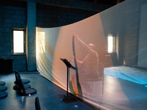 The image I have chosen of Tbakhi stands in complete opposition to this. It subscribes to nothing of sort, instead navigating the theatrical realm with a dogmatic rejection of Craft. For instance, objects are normally fetishized in reproductions of the Oriental East (eg. the veil) are subverted in the physical theatrical space. In, The Book of Dust, rather than a barrier separating an “Oriental object” from the audience, the veil becomes a physical barrier between act and audience themselves. Consequently, the Craft practices of costuming are denied dominion over “othering” cultural garb. In a similar rejection of visual and narrative Craft, the image’s visual narrative ascends upward rather than moving from a decided end-to-beginning. Within this image, Tbakhi does not cede ground to Craft, and consequently avoids the pitfalls our revisions to Herzog’s Queen of the Desert found inevitable. In short, I find that the question born out of Tuesday’s discussion readings/viewings/discussions was: “How do you revise presentations of the Middle East after they have so long been steeped in coloniality?” This image, then, illustrates the answer.