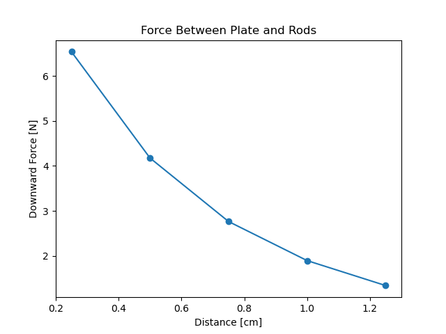 The double solenoid with iron rods with a separate iron plate was modeled as shown below, and the magnetic field was calculated such that the force between the magnetized iron rods and the iron plate as a function of the distance between them could be calculated. This distance is the distance from the top of the rods to the bottom of the plate.