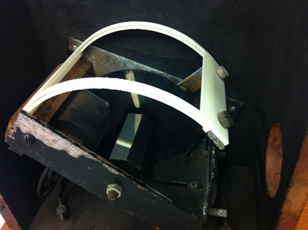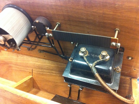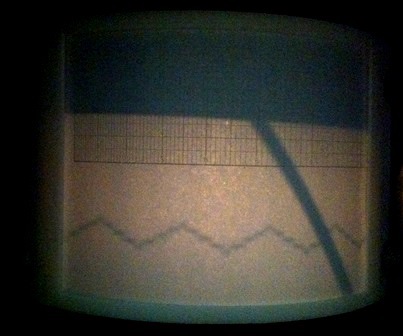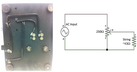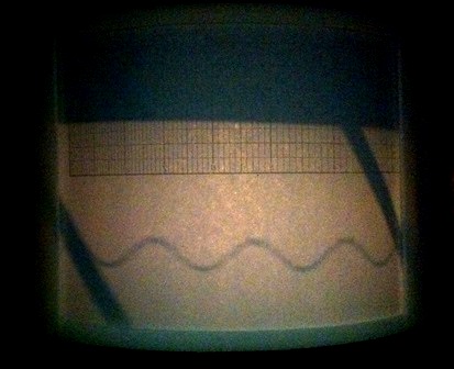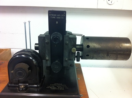 String Oscillogragh, first offered by General Radio in 1928, is a device that enables one to observe waveform of an electrical current in real time. This is accomplished by the following implementations. A very fine tungsten wire is positioned in a magnetic field supplied by a permanent magnet. When an electrical current flows through the wire, the wire will get deflected where the displacement of deflection is proportional to the amplitude of applied current. The string, being suspended in a beam of a powerful lamp, will then cast a shadow of itself upon an arc screen. Before the shadow strikes the screen, it will get reflected from an octagonal non-synchronous mirror, which rotates about an axis parallel to the line of string’s vibration, and be given an additional displacement that is proportional to time. As a result, string oscillograph converts waveform of electrical current into mechanical vibration, which is represented by spots of shadows well spread over the screen, eventually reproducing the waveform of the current which can be easily observed and studied.