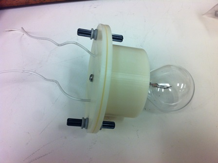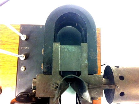 Figure 5 Galvanometer Unit. It includes a pair of permanent horseshoe magnets, two terminals for AC current input, light source (not shown), projection lens, condenser, a string holder (contains a piece of wire) and a potentiometer.