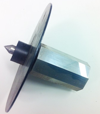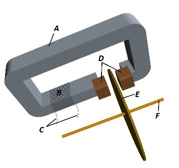 Figure 17 Illustration of the shaded-pole Motor. A: Permanent magnet. B: Solenoid wound on the magnet. C: Terminals connected to the variac (not shown). D: Shaded-poles (winding wires not shown). E: Aluminum plate. F: Shaft holding the plate and the octagonal mirror (not shown).