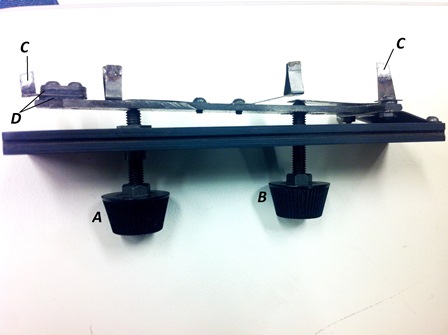 Figure 10 String holder (front view). A: Knob for adjusting the overall position of the string. B: Knob for adjusting the tension on the string. C: Contacts between the holder and the string. D: Two layers of insulators.